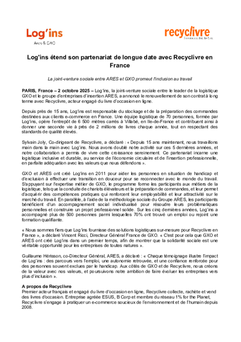 Notre entreprise tremplin adpatée Log'ins, poursuit son engagement en faveur de l’inclusion sociale et de la durabilité en prolongeant son partenariat avec RecycLivre, acteur majeur du recyclage de livres en France.